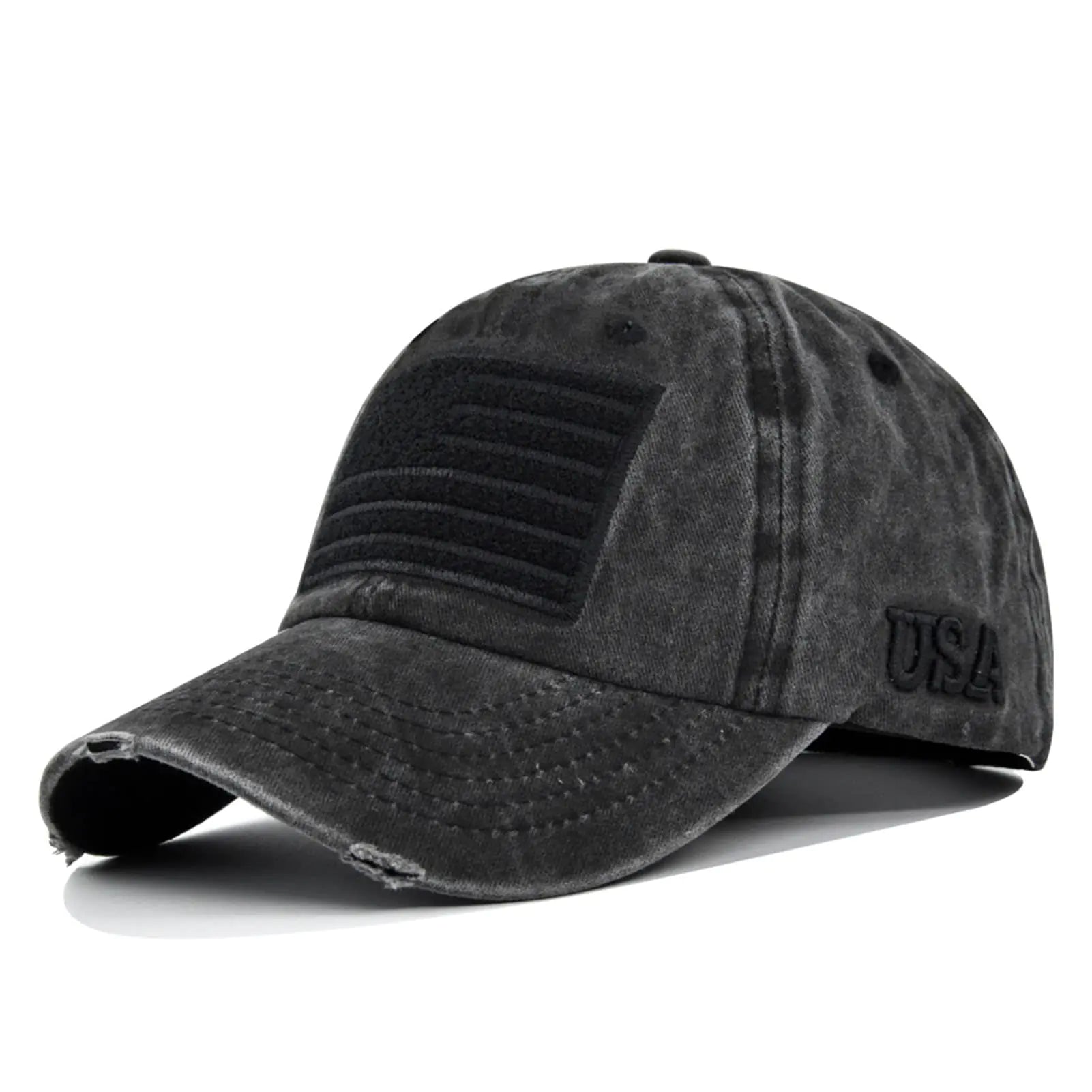 American Flag Baseball Cap Embroidery Adjustable Washed Vintage Cotton Denim Distressed Hat for Women Men Black