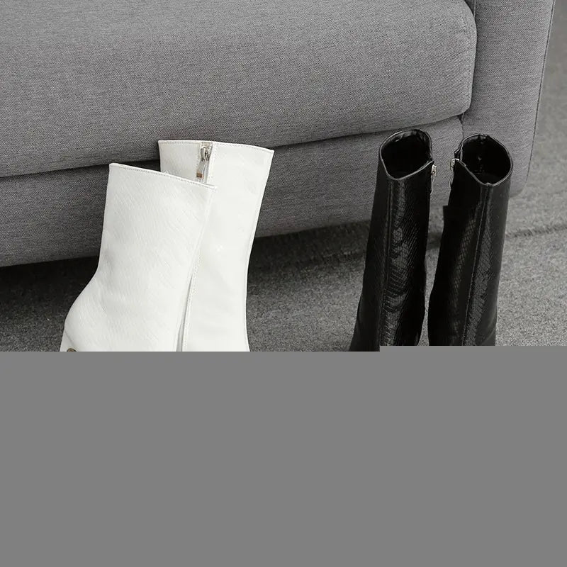 Available in classic black and chic white, these ankle boots feature a heel height of 11 cm that adds just the right amount of elevation while ensuring comfort with a 0.5 cm platform. The tube height of 17 cm offers a sleek silhouette that is perfect for pairing with both dresses and jeans.