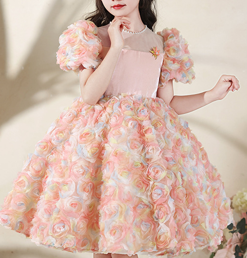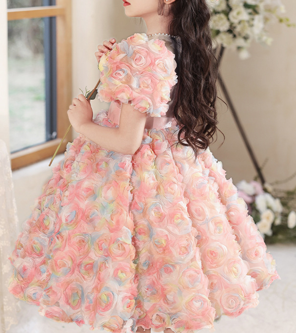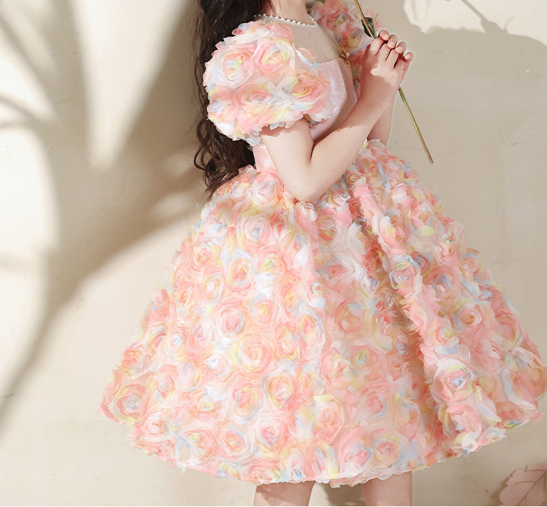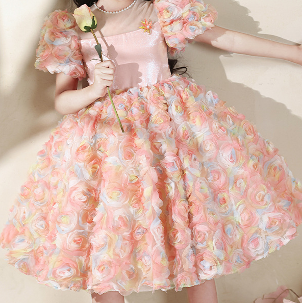 Featuring a stunning pink three-dimensional flower pattern, the dress is adorned with puffy sleeves that add a touch of whimsy to your look. The high waist design accentuates your figure while the short skirt length ensures you stay cool and stylish.